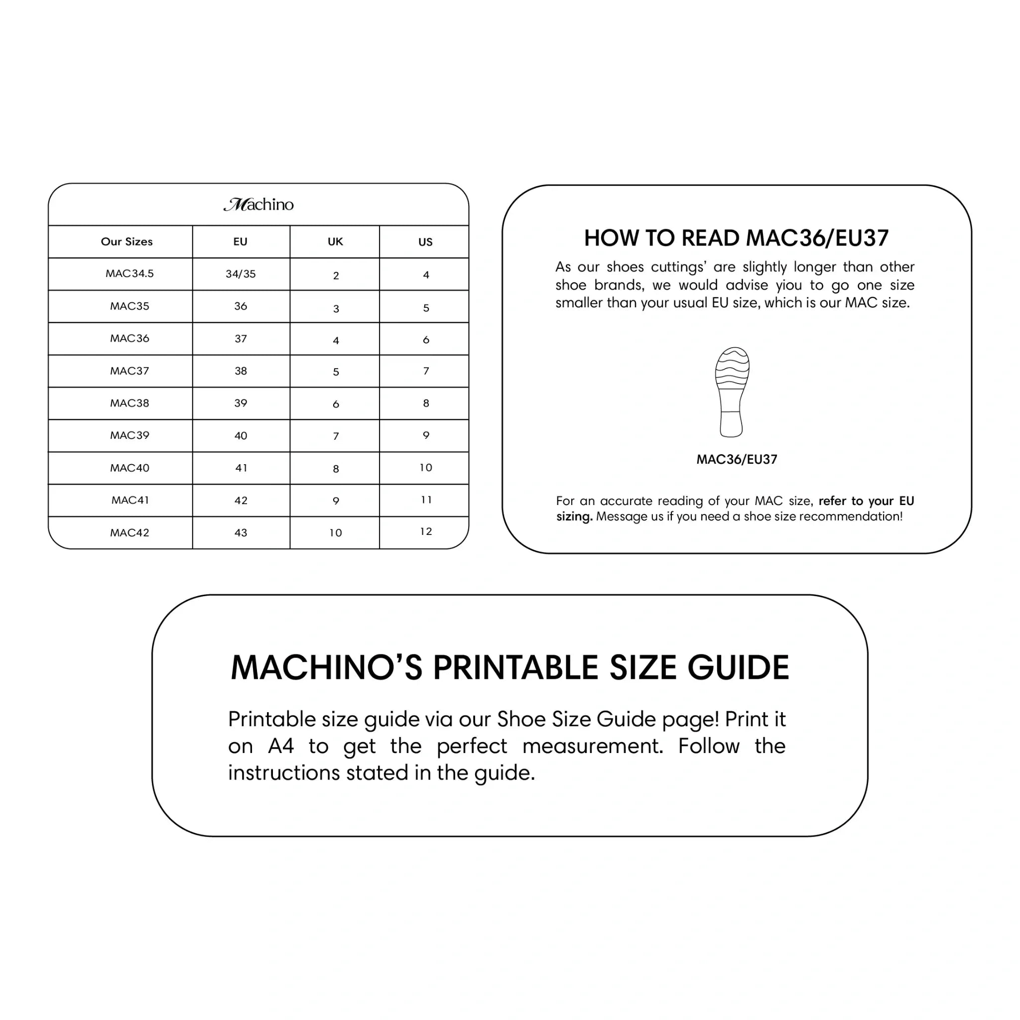 It is recommended to go one size up from your usual MAC shoe size for our new base design.
