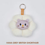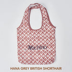 A sweet grey British Shorthair peeking from a fluffy white Hana flower, matched with a dusty rose geometric tote. Soft, cute, and effortlessly charming.