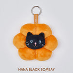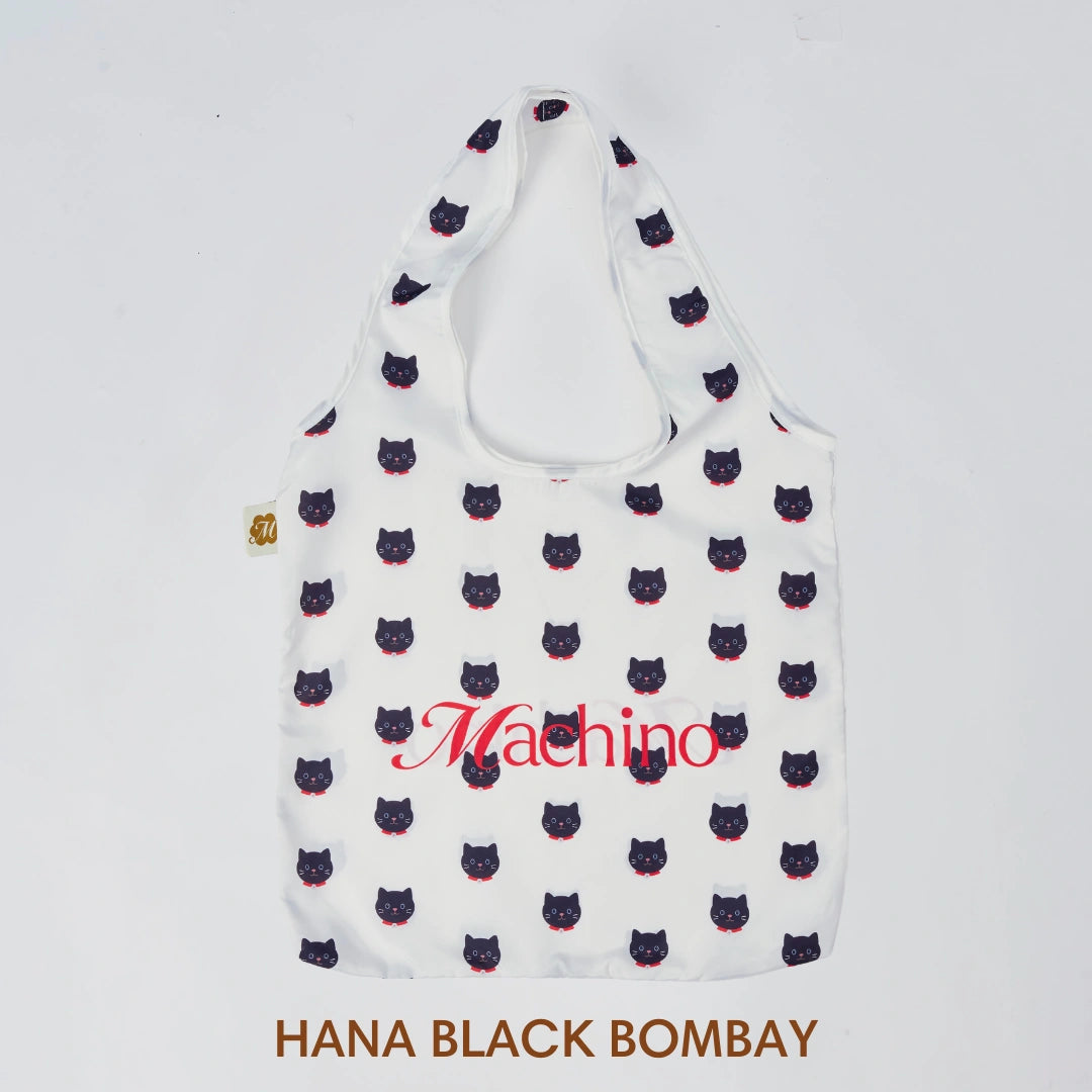 A sleek black Bombay kitty framed by a warm orange Hana flower, paired with an adorable white tote patterned with tiny black cats. Playful, bold, and full of personality.