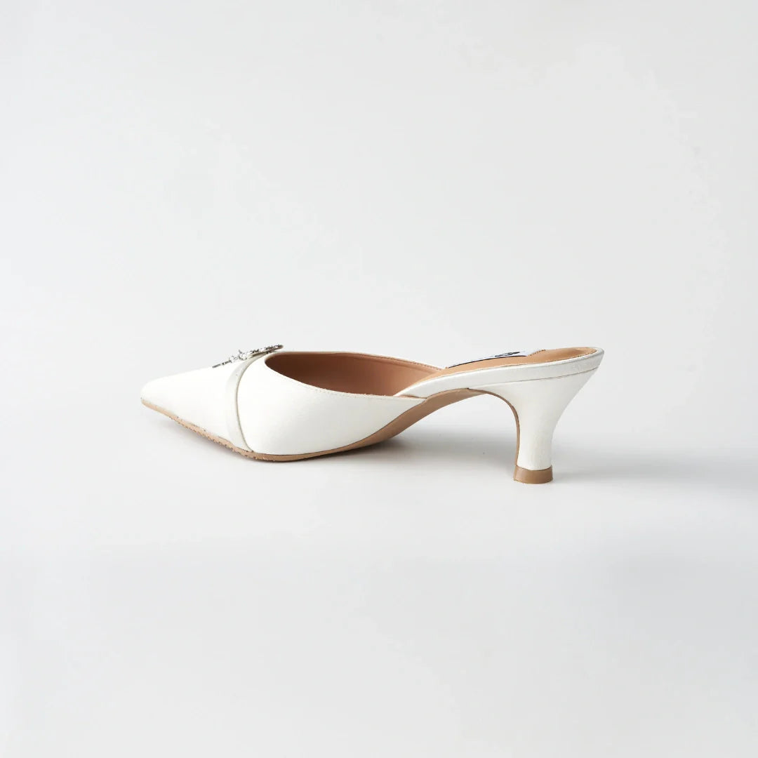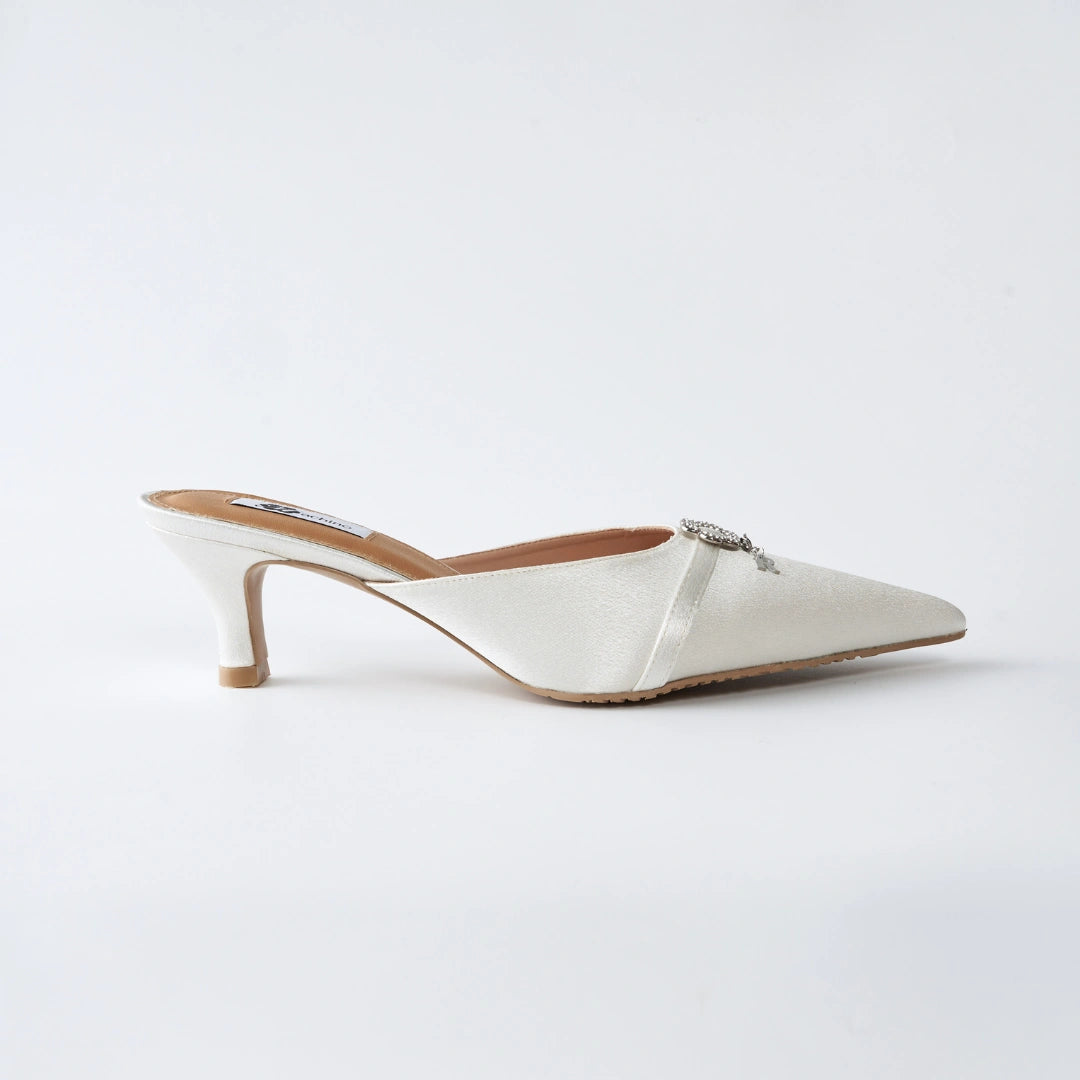 A modern muse for bridal mornings and elegant evenings, the Lyra Hana Mules in Ivory Satin are designed to carry you through life’s beautiful transitions with quiet confidence. Crafted in lustrous ivory satin, the 2-inch heels features a pointed, closed-toe design that elongates the legs while offering all-day comfort.