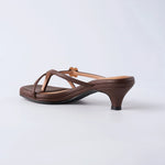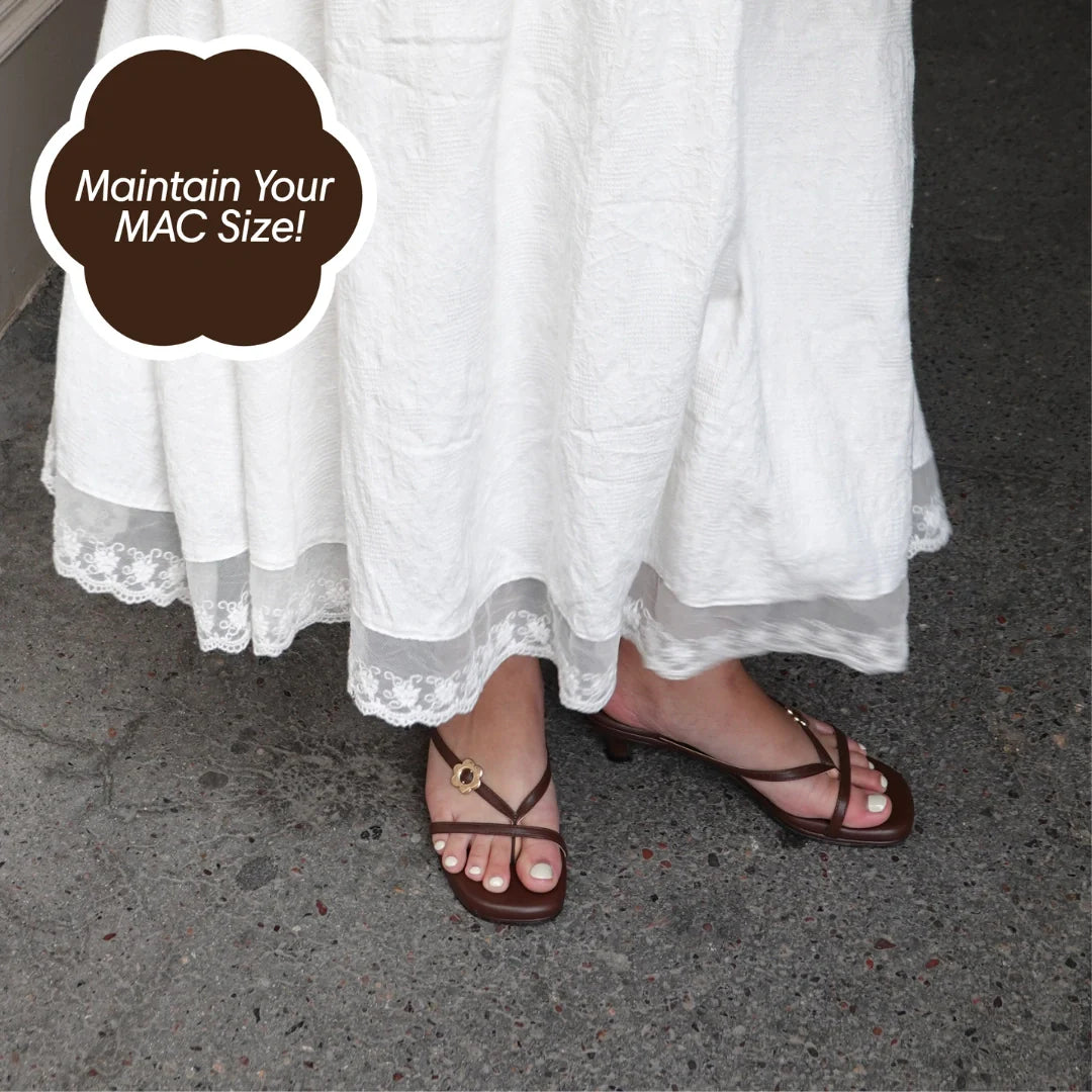 Minimalist elegance meets playful charm in our Thongs Hana Heels. Featuring slim, crisscross thong straps in rich espresso brown, these heels are designed to effortlessly elongate your silhouette. The sweet 1-inch low heel offers the perfect lift for day-to-night wear, while the golden Hana flower charm adds a signature Machino touch. Crafted with a thick cushioned insole and a square toe finish for both comfort and style, these heels are made for stepping out with confidence—anywhere, anytime.